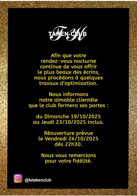 Le club sera fermé du dimanche 19 au jeudi 23 octobre inclus. Réouverture prévue le vendredi 24 octobre à 22h30